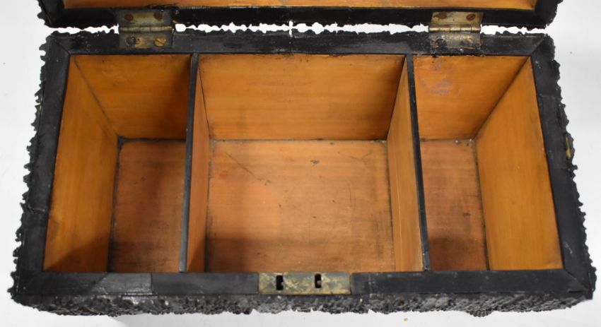 Anglo Indian / Ceylon / Sri Lanka large stag horn sarcophagus shaped tea caddy with Vizagapatam interior decoration to the lid, width 36cm
