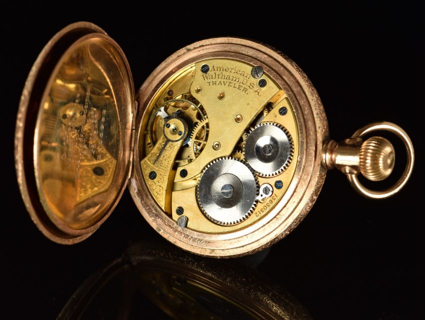 Waltham gold plated keyless winding full hunter pocket watch with inset subsidiary seconds dial, blued hands, black Roman numerals, white dial, engraved stag to the case and signed and engraved movement, case diameter 50mm, serial number 13630312.