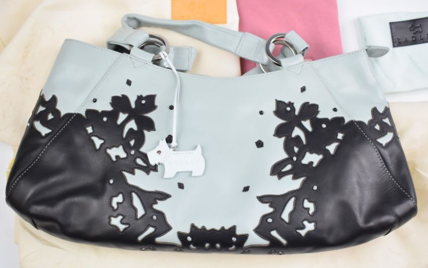 Three large Radley handbags and a purse, includes one with pink stitching and padlock clasp, all with dust bags