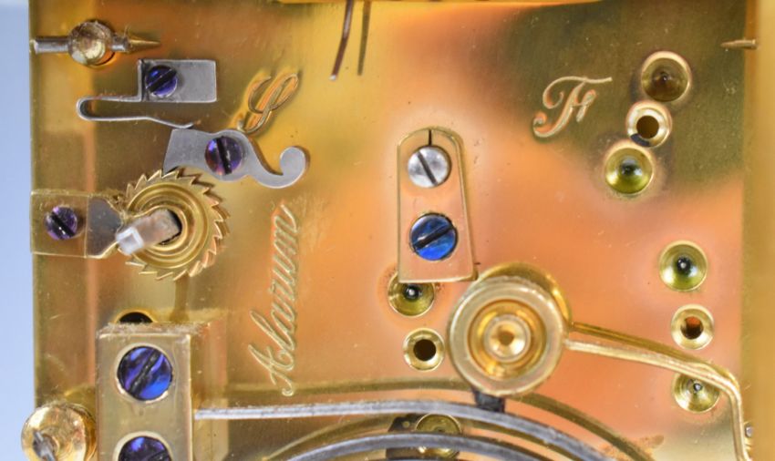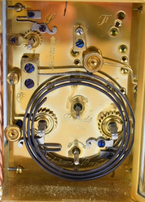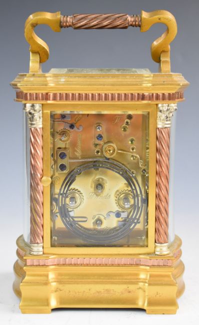 Richard & Cie gilt, silvered and copper plated repeating carriage clock, with bevelled and curved glass panels, the silvered and gilt dial also having an alarm dial below, the movement striking on a gong, height including handle 20cm