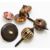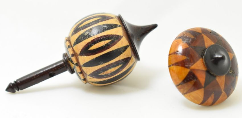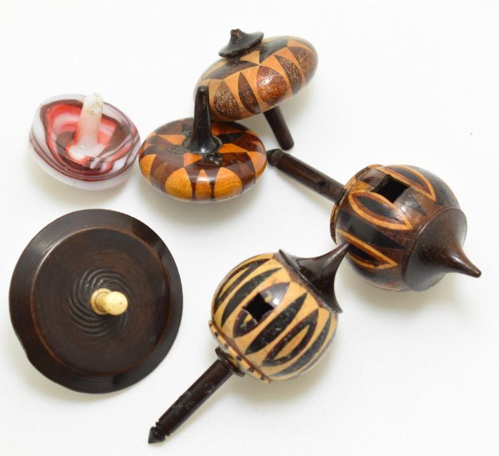 Six 19thC spinning tops comprising four Tunbridge ware, one glass and a treen example with carved spiral and bone knop