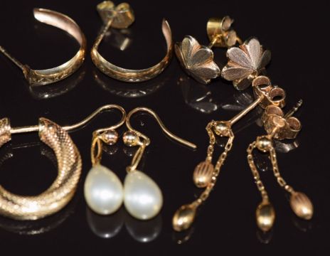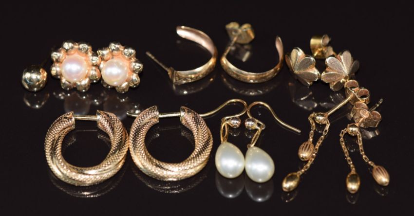Six pairs of 9ct gold earrings, two pairs set with faux pearls, 8.7g