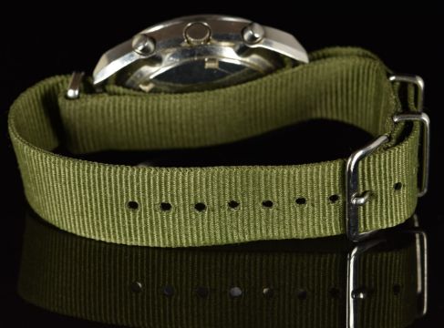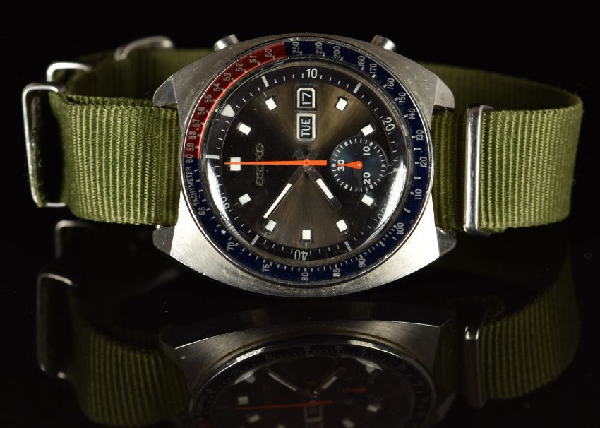 Seiko 'Pogue' gentleman's automatic chronograph wristwatch ref. 6139-6002 with day and date apertures, inset subsidiary seconds dial, grey/brown dial, blue and red 'Pepsi' bezel, stainless steel case and 17 jewel calibre 6139 movement, on stainless green NATO style canvas strap, case diameter 41mm, serial number 482779.