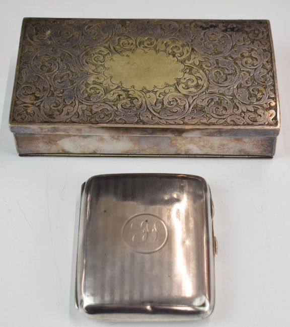 George V hallmarked silver cigarette case, Birmingham 1919, maker Smith & Bartlam, length 8.5cm, weight 76g, together with a silver plated sandwich box, length 14.5cm