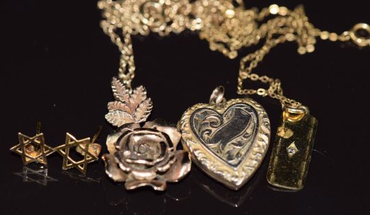 A 9ct gold pendant in the form of a rose, a 9ct gold pendant set with a diamond, two 9ct gold chains, a pair of 9ct gold earrings (6.1g) and a 9ct gold back and front locket