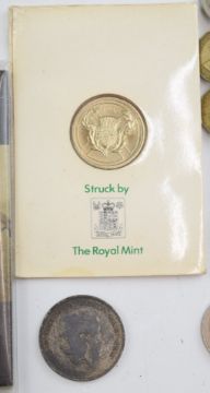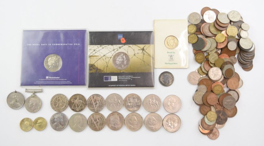 A collection of £5 crowns and other coins including some in presentation packs, together with sundry UK coinage George III onwards and a WW2 Defence Medal, in a vintage Coronation tin