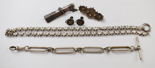 Victorian silver necklace embossed star decoration, silver fob chain converted into a bracelet, silver brooch in the form of a bow and a quiver of arrows, Victorian brooch and a pair of Victorian silver earrings