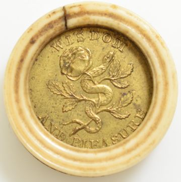 Whist / bridge interest set of four William IV 'Keep Your Temper / Wisdom and Pleasure' gilt brass tokens, in turned bone screw case, diameter 2cm