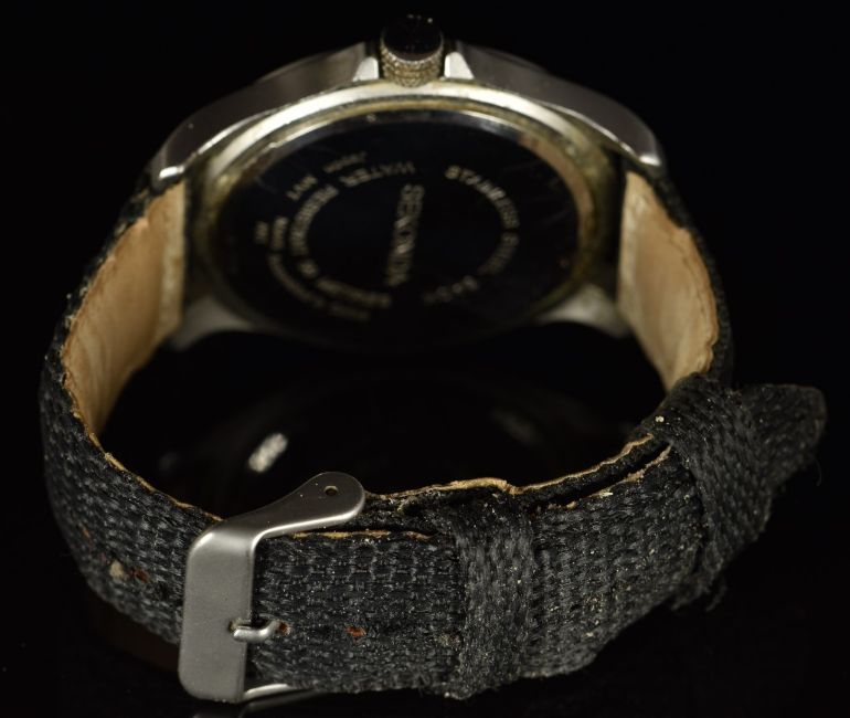 Sekonda military style gentleman's wristwatch with day, date and 24 hour subsidiary dials, luminous hands and Arabic numerals, black dial, stainless steel case and quartz movement, on black canvas strap, case diameter 42mm.