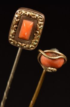 Victorian jet cross pendant inlaid with mother of pearl and four Victorian stick pins, two set with coral