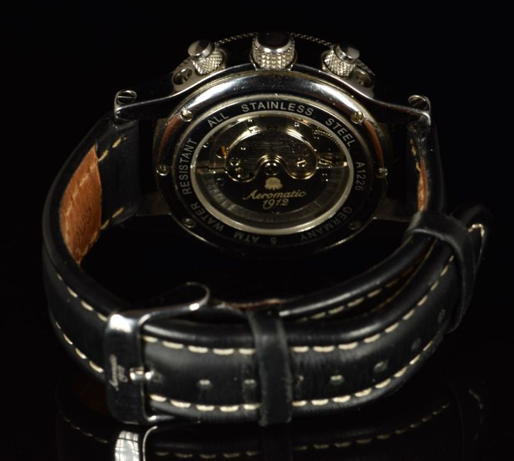 Aeromatic Disc Calendar gentleman's automatic wristwatch ref. A1226 with luminous hands and Arabic numerals, date, 24 hour and month apertures, day subsidiary dial, black dial, stainless steel case, clear exhibition case back and signed movement, on black leather strap, case diameter 44mm.