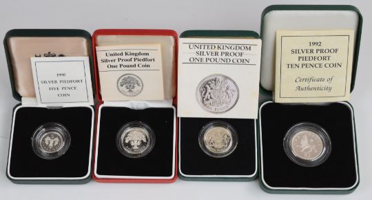 Four Royal Mint piedfort silver proof coins comprising 1983 £1, 1987 £1, 1990 5p and 1992 10p, all cased with certificates