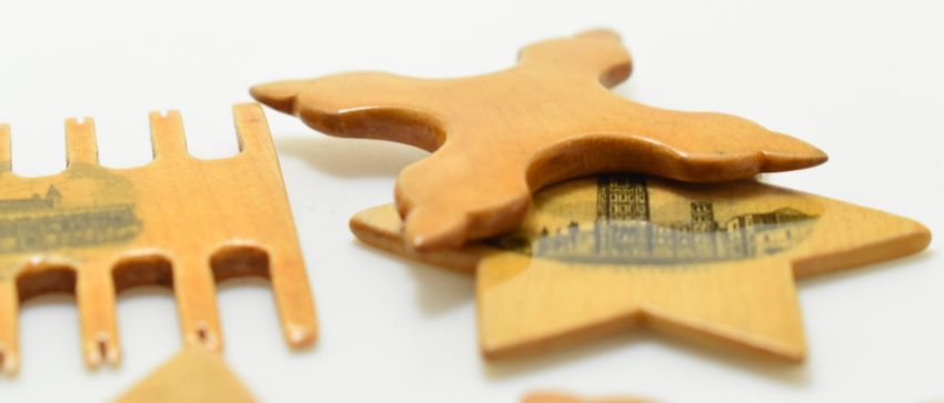 Sewing, needlework and embroidery Mauchline ware thread winders including a rare comb example for St Mary's, Bury St Edmunds, others include Deal pier, Aberfeldy, Irelands Mansion, Shrewsbury, Ely Cathedral etc