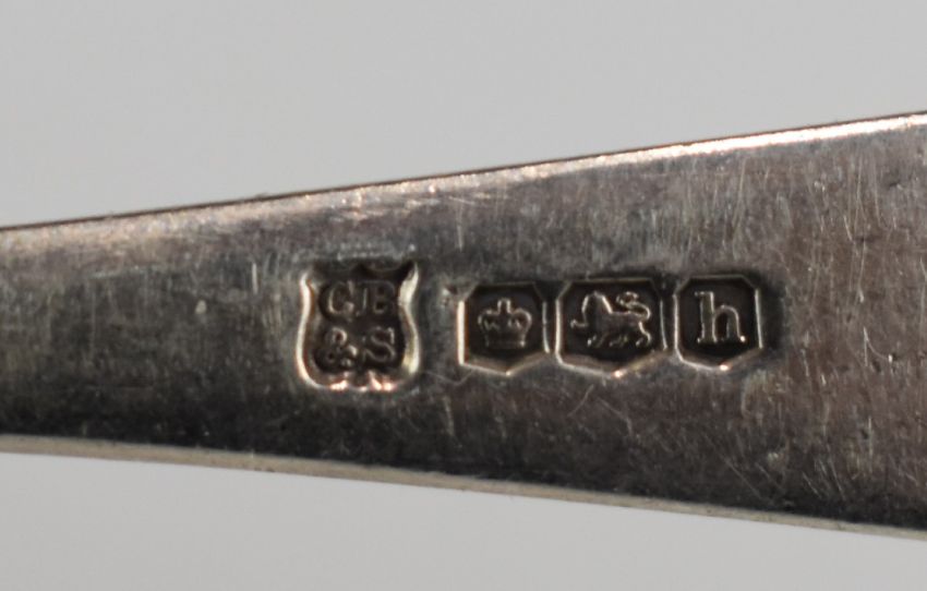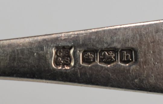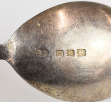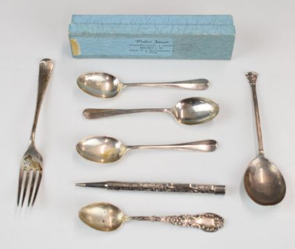 Hallmarked silver cutlery including Hanoverian rat tail pattern spoons, souvenir spoon marked sterling and a propelling pencil marked 800, weight excluding pencil 76g