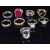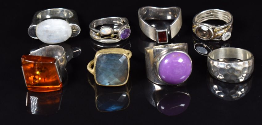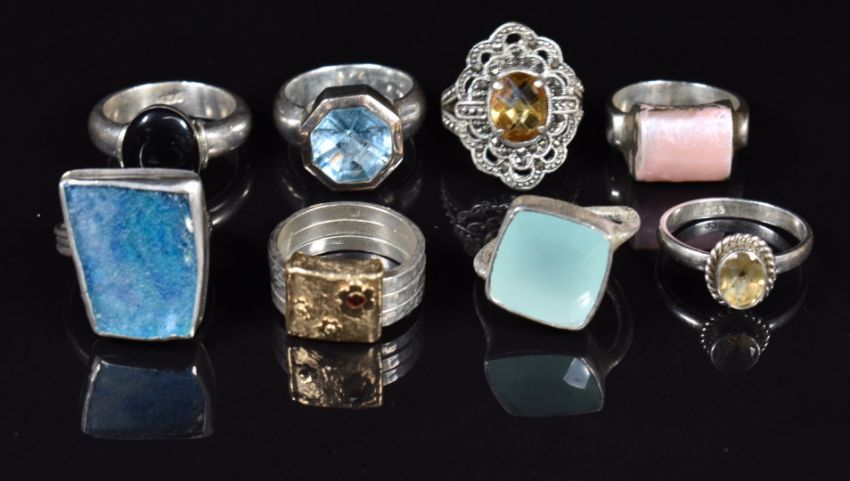 Thirty three silver rings set with quartz, ruby, pressed amber, etc