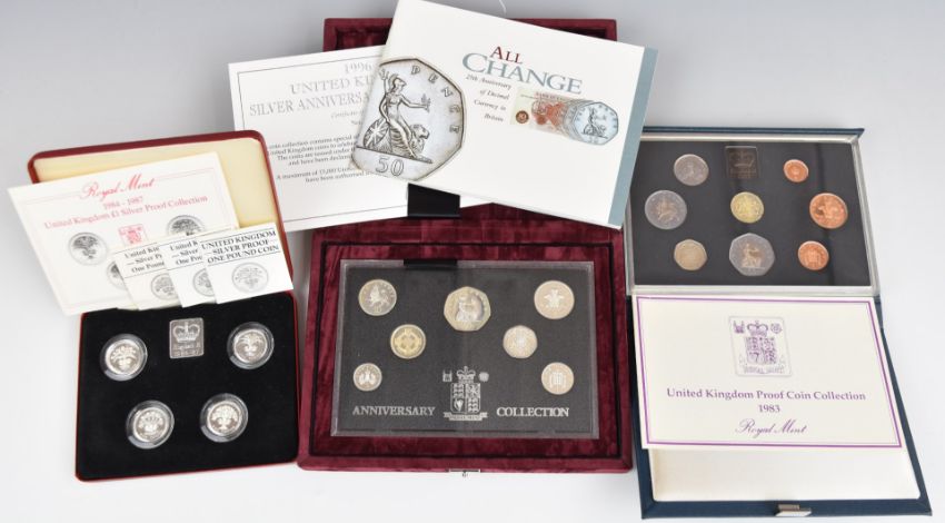 Three sets of Royal Mint silver proof coins comprising a 1984-1987 UK £1 collection, a 1996 Decimal Anniversary set and a 1983 proof set, all cased with certificates