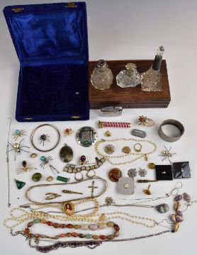 A collection of costume jewellery including silver necklace, agate necklace, spider brooches, 9ct gold back and front locket, silver brooch, silver bangle, etc