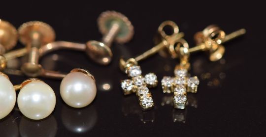 Three pairs of 9ct gold earrings set with pearls, a pair of 9ct gold earrings set with synthetic purple sapphires (7.2g) and a pair of 18k gold earrings set with diamonds (1.2g)