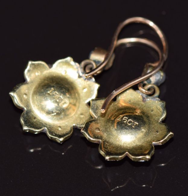 A pair of Edwardian 15ct gold earrings set with pearls in a floral setting, 3.4g