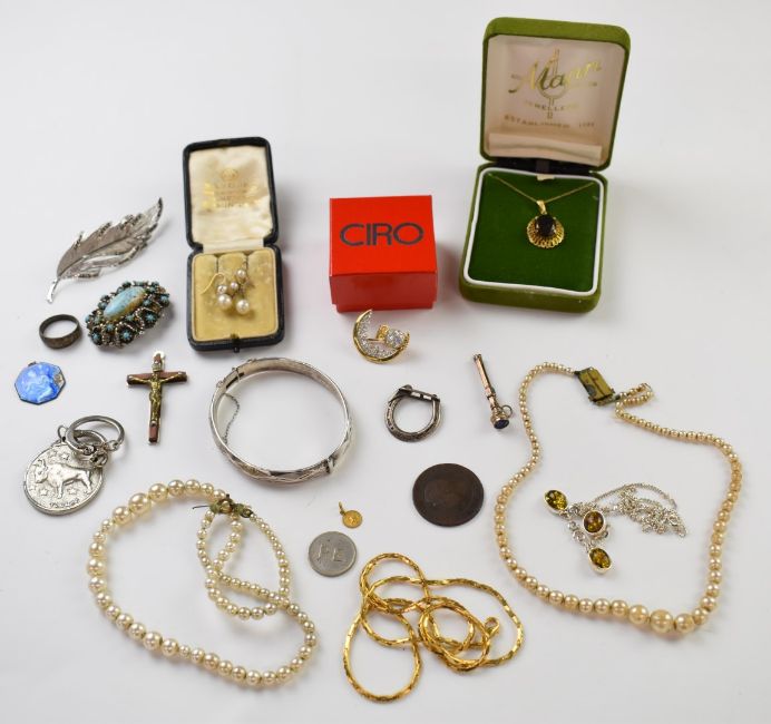 A 9ct gold pendant set with smoky quartz on a 9ct gold chain, silver bangle, silver ring, faux pearl earrings in vintage box, etc