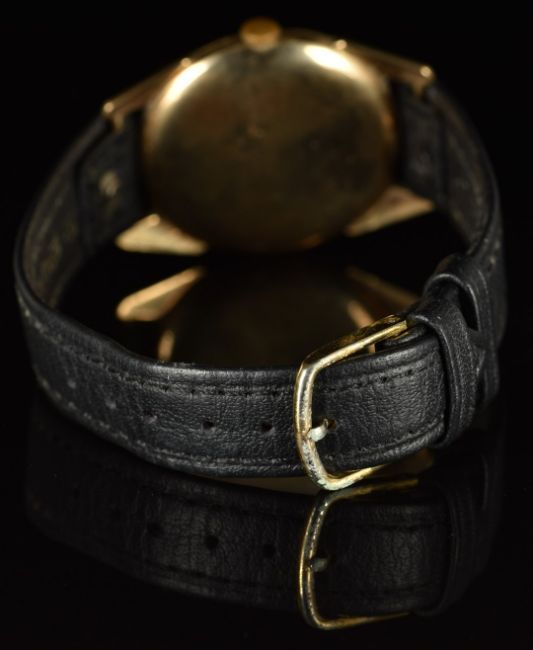 Avia 9ct gold gentleman's wristwatch with gold hands and hour markers, silver dial and mechanical movement, on black leather strap, case diameter 32mm.