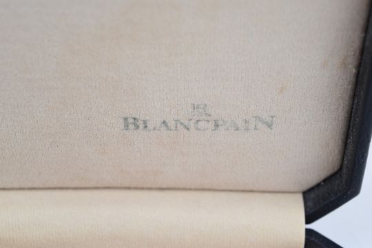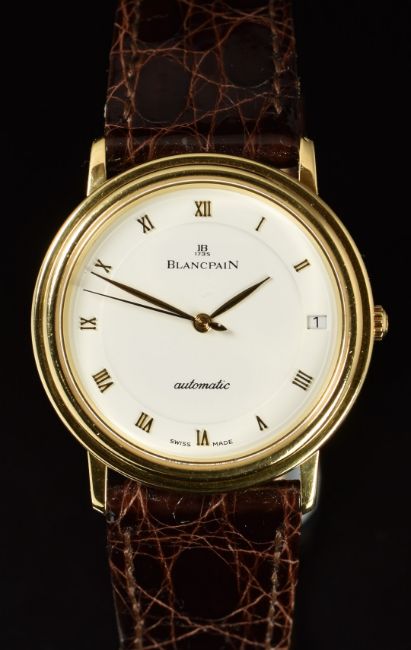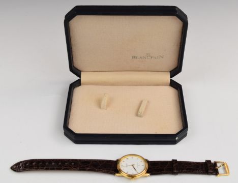 Blancpain Villeret gentleman's 18ct gold automatic wristwatch with date aperture, gold hands and Roman numerals, white dial and 18 jewel calibre 21 movement, on brown leather strap, case diameter 36mm, serial number 2432, in original box.