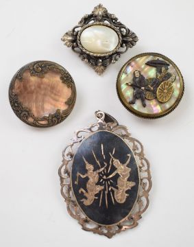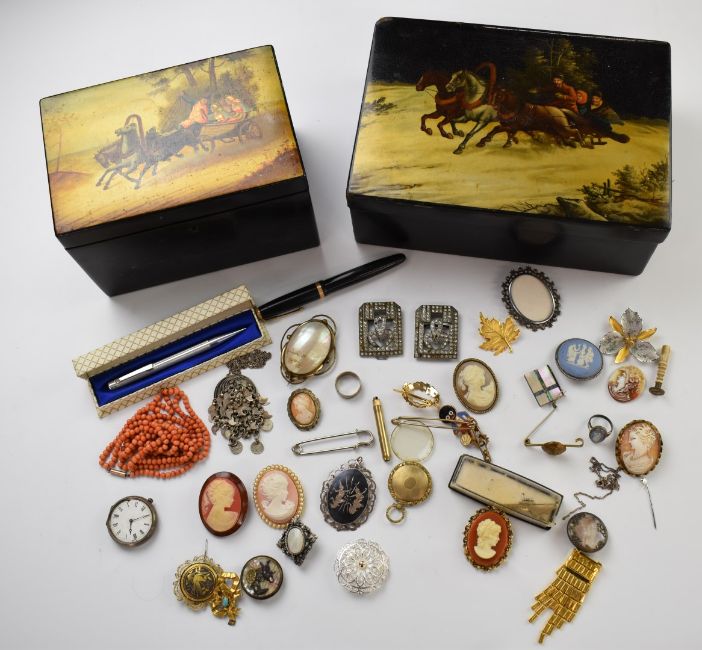 A collection of jewellery including silver Bond Boyd brooch, coral beads, 9ct gold brooch, Wedgwood ring and brooch, Victorian locket, Parker Duofold pen, yellow metal section of brooch etc, in a Russian lacquer tea caddy and box