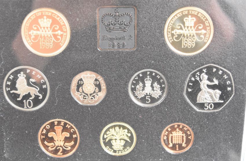 Four Royal Mint United Kingdom decimal proof coin sets 1987, 1988, 1989 and 1990, all in deluxe cases with certificates