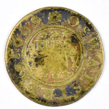 1669 Hugh Edwards 17thC one penny trade token, shoemaker 'Oswalstrey' (sic), shoe depicted on obverse, Spinks BW56, GF