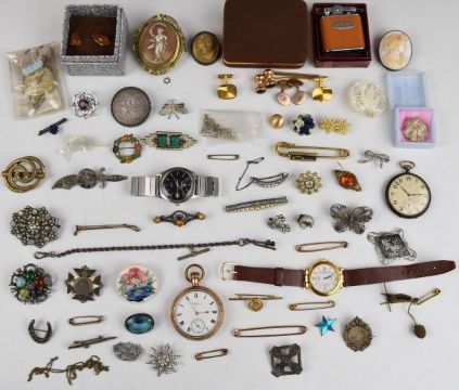 A collection of jewellery, brooches including silver 1821 crown, Victorian silver, silver set with paste, Miracle brooch, Scottish brooch, cameo, lava cameo, vintage, Victorian yellow metal, Waltham pocket watch, Roamer watch, etc