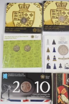 Nine Royal Mint brilliant uncirculated collectable coins, all in original packaging comprising four £5 examples 2010 London 2012 countdown, 2009 Henry VIII and 2017 and 2018 Christmas coins; three £2 examples; two 2013 Guinea anniversary and one 2010 Florence Nightingale and 2013 England and Wales £1 coins