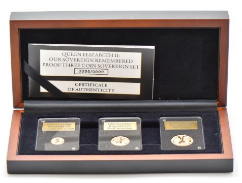 The London Mint Office 2022 three coin proof gold sovereign set commemorating the death of Queen Elizabeth II 'Our Sovereign Remembered', comprising full sovereign, half sovereign and quarter sovereign examples, in slabs and deluxe case with certificate number 0035/0999
