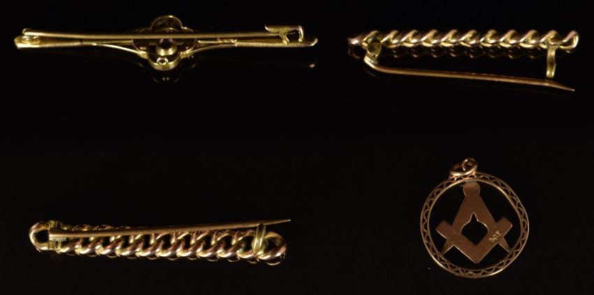 Three 9ct gold brooches, one set with an amethyst and a 9ct gold Masonic pendant, 9.1g