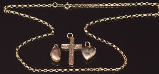 Three 9ct gold pendants in the form of a kidney bean, cross and heart and a 9ct gold chain, 6.1g
