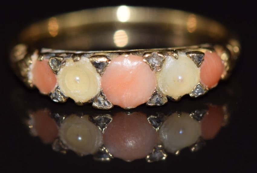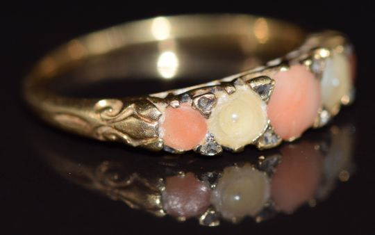 A c1900 18ct gold ring set with coral, pearls and diamonds, 2.8g, size N