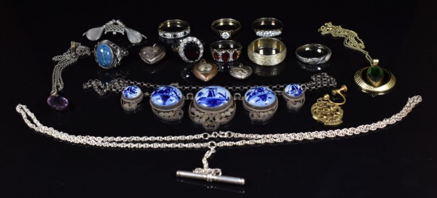 Eight silver rings, silver necklace, Delft necklace, Edwardian silver brooch depicting two tennis racquets and net, etc
