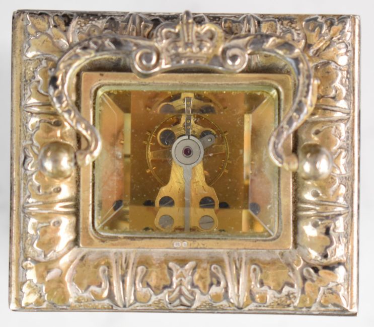 Charles Frodsham Jubilee commemorative hallmarked silver novelty miniature carriage clock, with caryatid supports, London 1978, maker's mark TC, the key is also marked as such, height including handle 10.5cm