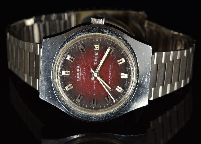Sicura (Breitling) gentleman's automatic wristwatch with date aperture, luminous hands, bevelled hour markers, red dial, stainless steel case and 21 jewel movement, on stainless steel bracelet, case diameter 40mm.
