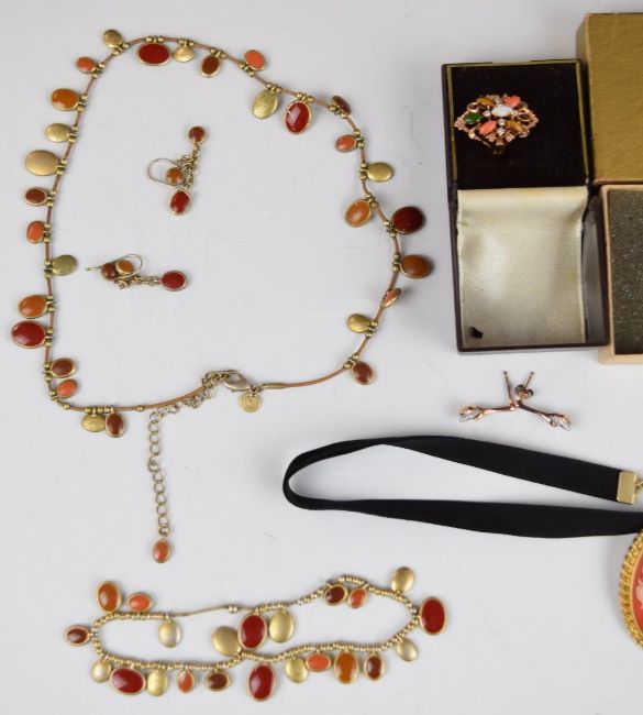 A collection of costume jewellery including yellow metal ring set with an opal, coral, tiger's eye, Exquisite brooch, etc