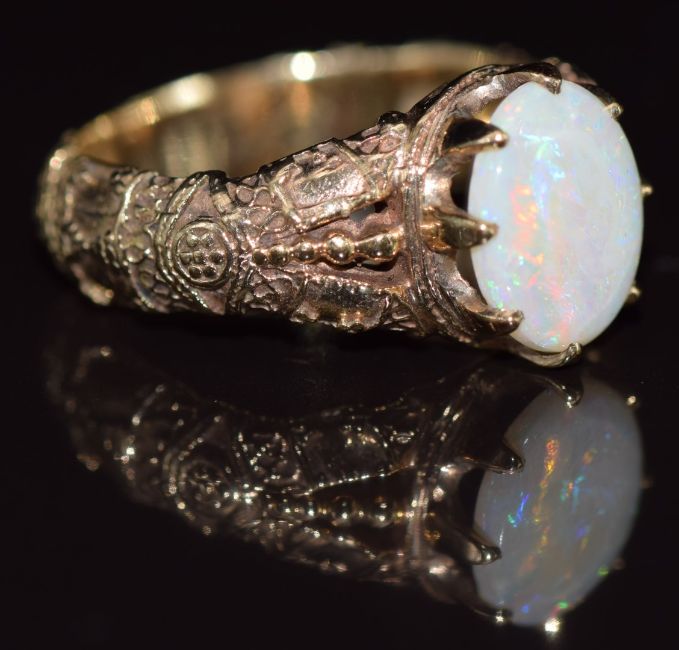 A 9ct gold ring set with an opal, with embossed decoration to the shoulders, 5.1g, size O