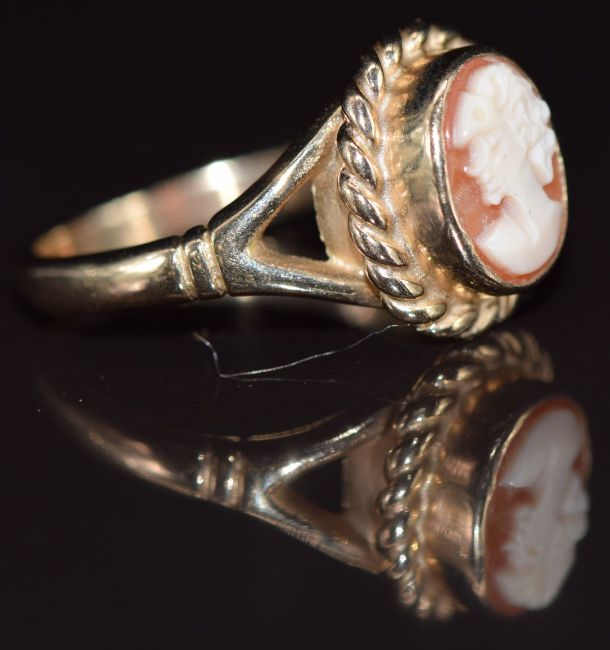 A 9ct gold ring set with a cameo depicting a young woman, 4.8g, size O