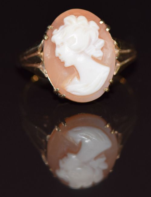 A 9ct gold ring set with a cameo depicting a young woman, 5.4g, size P