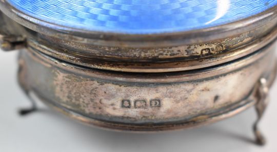 Art Deco hallmarked silver and blue guilloché enamel dressing table pot with hinged lid, raised on three feet, Birmingham 1928, maker's mark rubbed, diameter 8.5cm