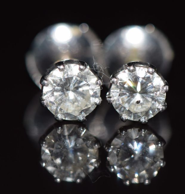 A pair of 18ct white gold earrings set with round cut diamonds of approximately 0.6 and 0.7ct, 2.5g 0.6cm