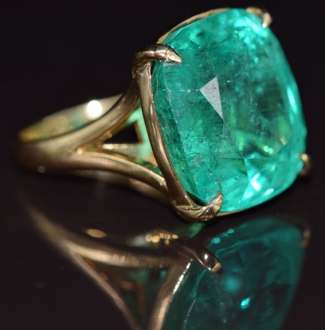 An 18ct gold ring set with an oval cut Colombian emerald of approximately 26ct, with AnchorCert certificate stating it to be a natural Colombian emerald, 17.2g, size O