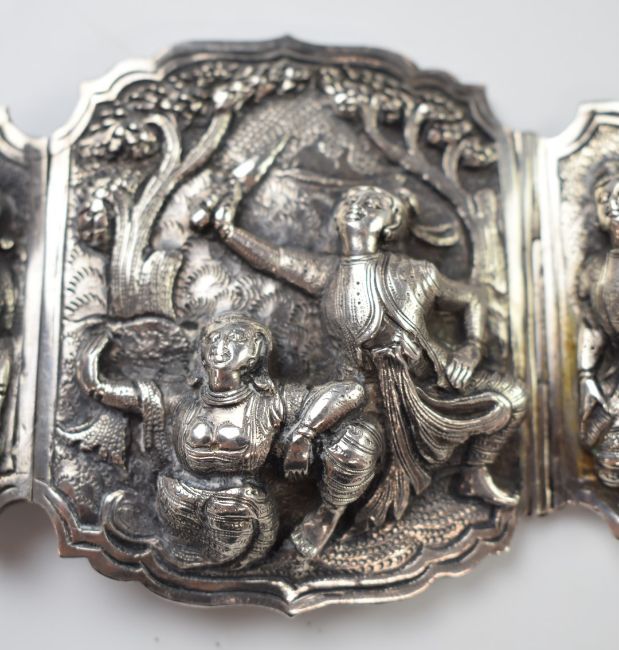 A white metal belt buckle with relief decoration depicting a Thai scene and a white metal bracelet set with agate