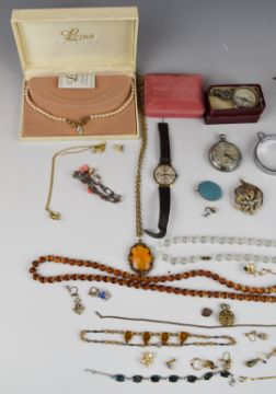A collection of costume jewellery including earrings, silver fob watch, brooches, etc