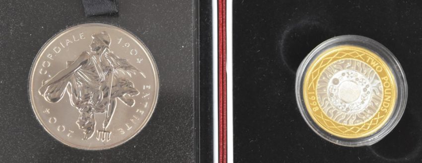 Royal Mint three silver proof coins comprising Entente Cordiale and two £2 coins, together with a CU Entente Cordiale, all cased with certificates