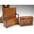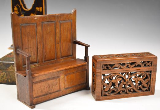 A collection of treen items, boxes and novelty items including a 19thC apprentice oak settle with removable seat, carved watch holder, specimen wood card and cigarette cases and desk tidies including a Zurich insurance advertising example, tallest 17cm