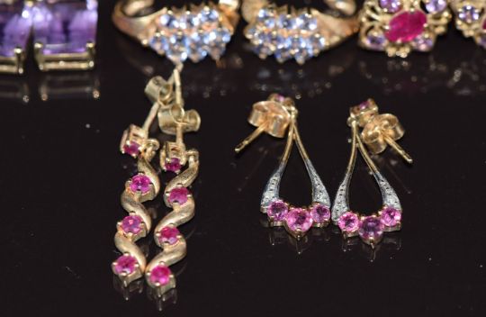 Five pairs of 9ct gold earrings set with amethysts, rubies, and tanzanites, 12.3g
